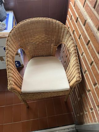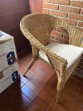 Acogedor sillón de ratán de Ikea, perfecto para añadir un toque natural a tu hogar. Su diseño combina a la perfección con cualquier estilo decorativo. - Estructura de ratán y madera. - Cojín de asiento en color beige.