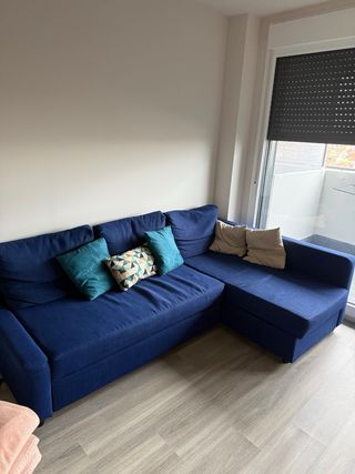 Sofá cama de Ikea en buen estado, ideal para aprovechar el espacio. Combina tonos azules e incluimos los cojines. - Tapicería de tela. - Diseño modular.