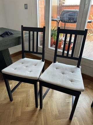 Conjunto de dos sillas de comedor de IKEA con cojines. - Estructura de madera en color negro. - Cojines de tela en color beige.