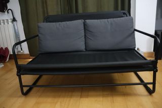 Vendo sofá cama modelo HAMMARN de IKEA. Es ideal para habitaciones pequeñas, pisos de estudiantes o visitas, ya que ocupa muy poco espacio y se hace cama en 10 segundos. Medidas: 128 cm de ancho. Se convierte en cama de 120x190 cm (caben dos personas). Diseño: Estructura metálica negra con red muy resistente. Completo: Lo entrego con 2 cojines grandes del respaldo originales en color gris oscuro. (No tiene colchoneta, como se ve en la foto) Ventaja: Es súper ligero y fácil de transportar. Estado: La estructura funciona perfectamente, la tela de red está tensa y los cojines están bien.