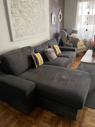 Sofá Kivik de tres plazas de IKEA, en color gris y tejido de tela. Está en buen estado y es muy cómodo, únicamente tiene uno de los cojines con la funda raspada, que se puede sustituir o poner una funda en todo el sofá. - Perfecto para relajarse. - Diseño sencillo y elegante.