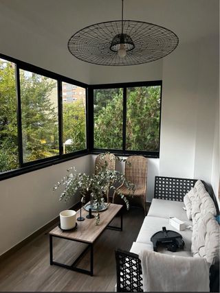Mudanza; recogida inmediata en Madrid Chamberí. Conjunto de sofá modular para terraza o balcón, con estructura de madera y cojines blancos. - Diseño de lamas de madera en el respaldo. - Cojines de asiento cómodos y de color blanco. - Candelabro de mimbre - Alfombra de yute
