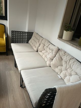 Sofa exterior de ikea modelo jutholmen Comprado en julio de 2025, por lo que esta prácticamente sin usar Es modular, por lo que cada asiento se puede usar de manera independiente si se quiere - Diseño de 3 plazas. - Cojines color beige, de ikea, modelo kuddarna Urge recogida por mudanza antes del 10 de febrero