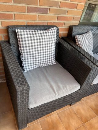 Conjunto de muebles de exterior con un diseño moderno y elegante. - Estructura de ratán sintético. - Color negro - Incluye sofá, 2 sillones y mesa auxiliar Incluye almohadones para los asientos y cojines vichy No se envía, para recoger en zona Aragonia (Zaragoza) Sillon medidas fondo 66 x ancho 74 x alto 80 Sofá medidas fondo 66x ancho 132 x alto 80 Mesa 56x 56 x 34 Mobiliario terraza jardín exterior