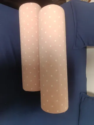 Set de dos cojines grandes cilíndricos rosas con un diseño de lunares. Medidas 70 cms de largo y 20 cms de diámetro. Relleno de alta densidad, duro. - Diseño de lunares blancos sobre fondo rosa. Desenfundable para lavar la funda. - Forma cilíndrica, ideal para sofá o soporte cervical. Tambien para rodarlo en el suelo en cuarto de niños.