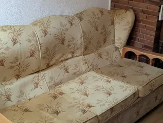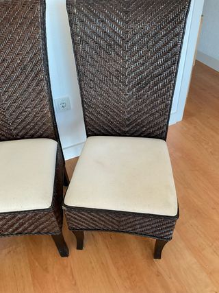Acogedor sofá de mimbre con un diseño encantador. Perfecto para añadir un toque rústico a tu hogar. - Estructura de mimbre resistente. - Incluye dos cojines decorativos con estampado. - Tonos marrones y multicolor en los cojines. Tiene signos de uso Es para adolescentes Creo que no más de 50 kilos de peso Yo peso 80 y cuando me siento hace crik sin embargo mis hijos pesan menos de 60 y no suena
