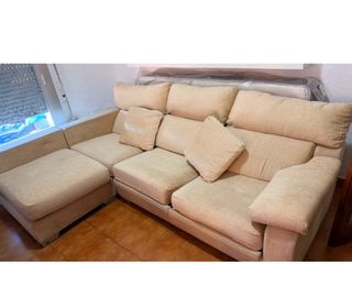 Sofá cama con chaise longue en polipiel blanco. Es un mueble versátil que combina comodidad y funcionalidad. - Diseño moderno. - Tapicería de fácil limpieza. - Incluye cojines decorativos. Presenta algunas marcas de desgaste de la piel sintética. Perfecto para uso con funda. Se vende por mudanza. Recogida en Arenys de Mar.