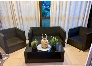 Conjunto de mobiliario de exterior. - Sofá de dos plazas. - Dos sillones individuales. - Mesa de centro con superficie de cristal. Tiene uso, pero con una capa de pintura y unos cojines, quedará bien.