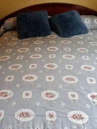 Edredón para cama de matrimonio de 1.35 metros. Presenta un diseño con cuadros y motivos florales. - Incluye doble volante. - Siempre retirado para dormir. - Cojines azules pelo largo. - Precio no negociable.