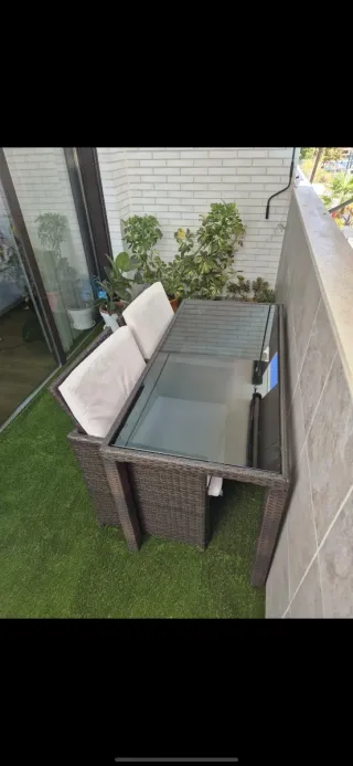 Conjunto de mobiliario para terraza. - Base de madera. - Cojines con estampado tropical. - Dos cojines de apoyo de color verde. - Mesa de cristal - 4 sillas plegables con cojines - estantería pared baldas cristal - cesped 4 x 1,75 m También lo vendo por separado. Preguntad precio.