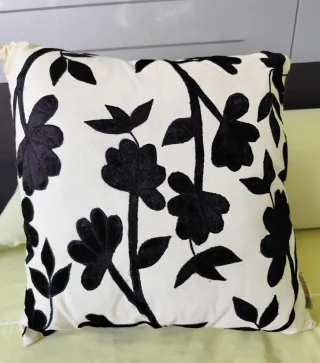 Cojín decorativo de la marca Edrexa, con un diseño floral en contraste. - Color blanco y negro, con un diseño floral muy elegante. - Con relleno - Medidas 45x45 - Diseño de flores y hojas en relieve. - Base de tela blanca