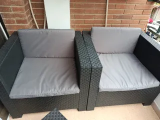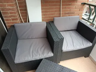 Conjunto de muebles de exterior para jardín o terraza con cojines formado por dos sillones individuales y mesa. Fácil almacenaje, la mesa puede guardarse en un sillón como se ve en la imagen.