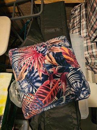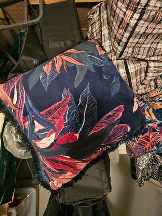 Cojínes de 47 x 47 con estampado de hojas en tonos verdes y amarillos. Tejido para exterior. Tienen un año, están como nuevos, en perfecto estado. 4€ cada uno.