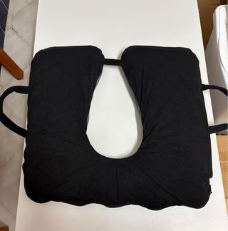 Cojín ergonómico con diseño en forma de U para mayor comodidad. Está partido por un lado por un mal lavado pero no afecta a su funcionalidad. - Tejido con puntos antideslizantes. - Asa lateral para facilitar su transporte.