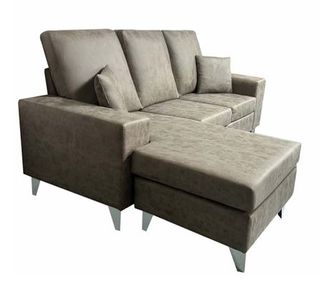 Chaiselongue de tres plazas en color marrón. Es un sofá cómodo y elegante, ideal para relajarse. Shaiselongue.- Armazón de madera.- Relleno de espuma.- Módulo pouf independiente, se puede puede cambiar de posición a derecha o izquierda en cualquier momento. - Incluye 2 cojines decorativos 35x35 cm. Colores piedra y cemento