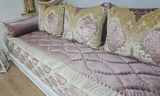 Preciosa colcha y juego de cojines para cama de 135. El conjunto está en perfecto estado y tiene un diseño delicado y elegante. - Incluye una colcha y dos cojines. - Tejido suave y de gran calidad. - Ideal para crear un ambiente acogedor y sofisticado en tu dormitorio. - Incluye ropas para mesa camilla y si se desea la mesa camilla sería entrega en huesca