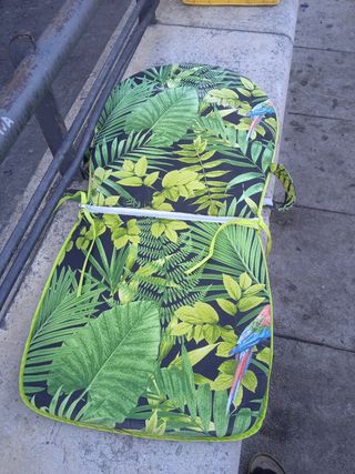 Cuatro sillas de madera pintadas de blanco. Se incluyen cuatro cojines con estampado multicolor. Las sillas están en buen estado, aunque muestran señales normales de uso. Cómo se ve en la foto, la de abajo, tiene un poco levantada la madera. - Ideales para comedor o cocina. - Cojines lavables. - Patas de hierro resistentes. 5 euros cada una.