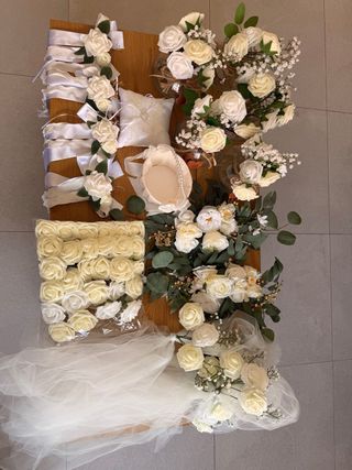Lote de decoración para bodas con un estilo romántico y elegante. - 4 cintas con flores para el coche ( foto #2) - 1 Cojín para anillos. (Foto #3) - 1 Canasto para petalos. (foto #3) - 6 colgantes para sillas (foto #5) - Flores sueltas 30 aprox ( blancas y crema foto #6) - 2 horizontales para mesa (foto #7) - 5 jarros de cristal con corazón de madera ( foto #8/9) tambien llevan pequeños arreglos como se ve en la foto #4 Envio rapido y bien embalado.