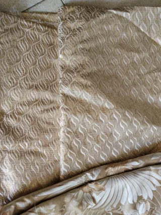 Conjunto de fundas para salón con un diseño elegante y llamativo. - Combinación de tejidos satinados y de terciopelo. - Tonos dorados y anaranjados que aportan calidez. - Texturas y estampados que añaden un toque de distinción. Incluyen 3 fundas de 2 metros de cada una y 9 almohadas y 3 cojines de decoración.