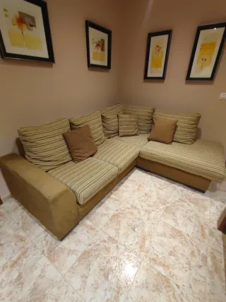 Sofá chaise longue con dos puf. Tiene un poco descosido un cojín como sale en la foto, por lo demás está nuevo. Medidas: largo 2'42 88 centímetros de ancho+35 centímetros de ancho de salida de los asientos 1'65 la parte del chaise longue