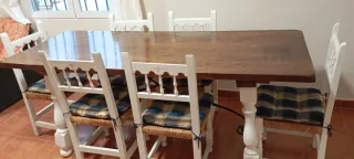 Conjunto de mesa de comedor rústica y seis sillas. - Mesa de madera con patas torneadas. - Sillas de madera pintadas en blanco. - Cojines a cuadros incluidos.