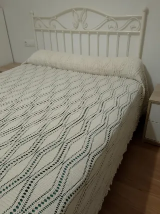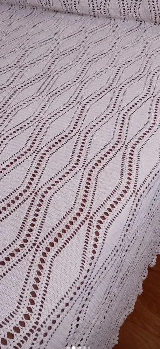 Colcha de ganchillo de hilo blanco 100% algodón. El acabado en la parte de abajo es de flecos. Medidas: Ancho 1,62 cm. x Largo 2,28 cm. Tengo dos unidades una 35 €, las dos 60 €.