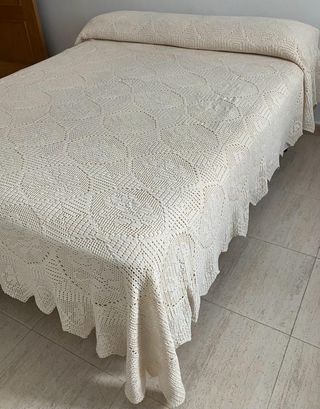 Se vende colcha artesana hecha a mano de ganchillo, con hilo de perle egipcio, color hueso a punto madroño. Para camas de 1,35 y 1,50. Palabras: Cama, decoración, antigua, manualidades, habitación,