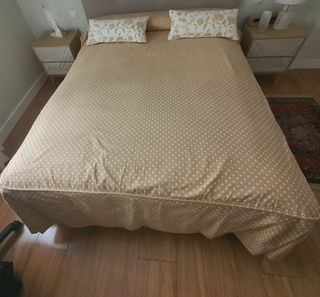 Colcha completamente nueva reversible de la marca Cotton ARTean (CottonArt). Perfecta para Primavera, Verano y Otoño. Por un lado es beige y por otro blanco. Medidas 2,50m x 2,70m. A recoger en Bilbao o envío a cargo del comprador - Diseño reversible, dos estilos en uno. - Perfecta para cama individual o doble (depende del tamaño).