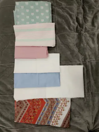 Conjunto de retales de tela y una colcha. - Colcha de 2,40 x 2,20 metros. - Diseño multicolor con motivos florales y geométricos.