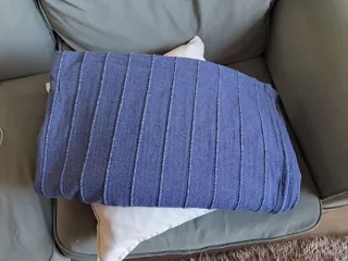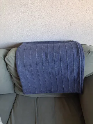 Colcha de la marca Ikea, con un diseño de rayas verticales.yo la usaba para cubrir el sofa.Mide 2,10 cm de ancho y2,50 cm de largo. - Color azul y verde oliva. - Hecha de tela.