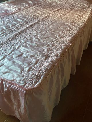 Colcha para cama de matrimonio de 135 cm, en un bonito tono rosa. Se encuentra bien cuidada. - Diseño con relieve. - Tejido agradable al tacto.