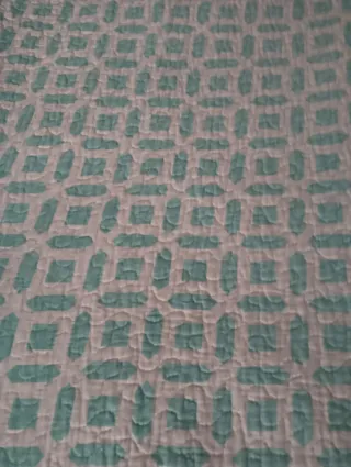 Preciosa colcha de algodón con estampado geométrico en tonos blancos y verde azulado. Está impecable y lista para usar. - Medidas: 240x220 cm y 50x60 cm (2 fundas de almohada) - Diseño moderno y elegante.