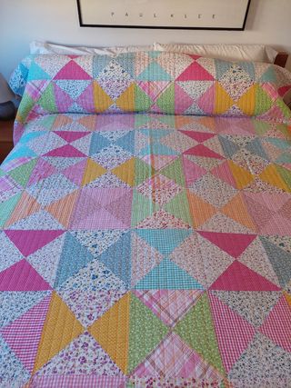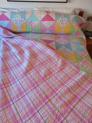 Colcha de patchwork con un diseño de rombos y cuadrados. 2,20x2,70 - Estampado floral y de cuadros. - Tonos verdes y rosas predominantes.