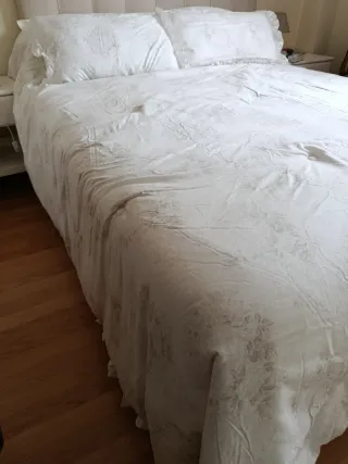 Colcha de invierno con un bonito estampado floral. - Diseño elegante en tono beige. - Confeccionada en poliéster de calidad. - Incluye dos fundas para almohadas de 75 cm - Comprada en tienda San Carlos - Comprada y no usada. - Precio original 141'99 euros