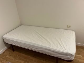 90x190cm. Estructura de cama (somier) de Flex S-200, lamas de madera. Colchón HÖVÅG de IKEA en gris firmeza media + protecor de colchón LUDDROS. Tiene uso de un año solo. Vendo por mudanza.