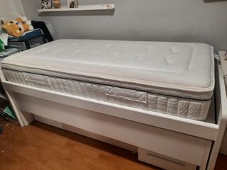 Colchón de 90cm. Muy buen estado, bien cuidado, sin manchas y muy poco utilizado. Ha estado en una cama nido sin haber sido utilizado, tapado con funda de tela a medida. Muelles bicónicos. En las fotos aparece por ambas caras / lados. 90cm de anchura por 1'88m de altura. Grosor 14cm.