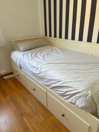 Urgente.Cama individual de 90cm con un diseño práctico y funcional. - Estructura de madera. - Frontales de cajón en blanco y gris. - Laterales y base en acabado madera. Le faltan dos cajones yo lo utilizó para caja de almacenaje la base esta impecable el colchón no está a la venta