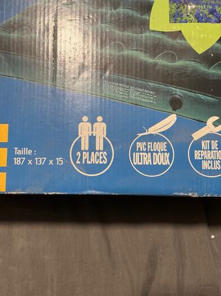Colchón hinchable para dos personas, ideal para camping o uso temporal. Incluye kit de reparación. - Medidas: 187 x 137 x 15 cm. - Material: PVC flocado ultra suave. - Apto para interior y exterior. - Tratamiento anti-olores, anti-bacteriano y anti-humedad. No lo he estirado porque está metido en la caja original