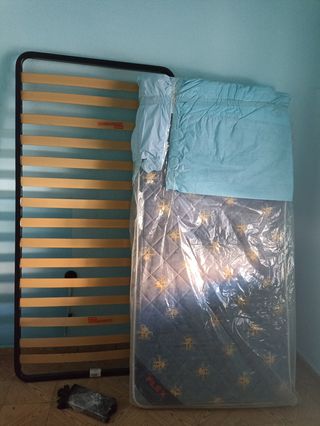 Se vende somier de láminas de 90 cm y colchón Lamflex de 90 cm. El colchón está nuevo, aún en su plástico. El somier está en buen estado. - Medidas: 90 cm. - Incluye: 1 somier de láminas y 1 colchón Lamflex.