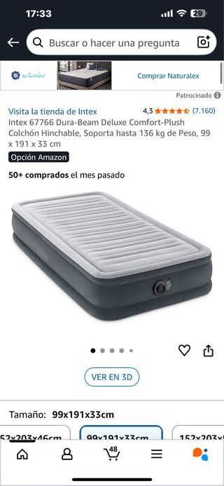 Colchón hinchable Intex modelo Dura-Beam Standard, ideal para camping o invitados. - Tecnología Fiber-Tech. - Dimensiones: 76cm x 1.91m x 25cm (30 x 75 x 10). - Color azul. Nunca se a usado, solo se abrió para comprobar que no venía pinchado. Está sin usar.