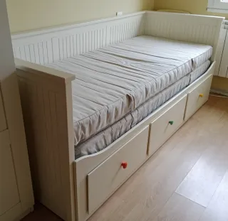 Diván modelo Hemnes de IKEA, con un diseño clásico y funcional. - Estructura de madera. - Acabado en color blanco. - Incluye tres cajones de gran capacidad. Está en buen estado pero tiene algunos railes de los cajones algo oxidados como se ve en la foto. Los colchones estan en perfecto estado, uno está nuevo no se ha usado nunca.