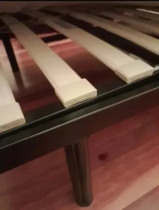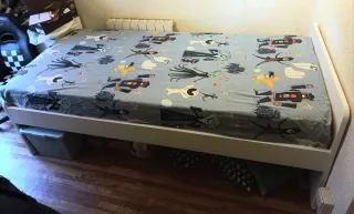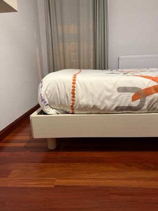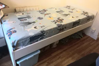 Se vende cama individual de 90cm con su colchón viscolastico. Es el modelo Släkt de Ikea.(En las fotos se ven las medidas) - Estructura de madera color blanco. -Colchón viscoelástico. *Recoger en Aperribai(Galdakao), no se envia*