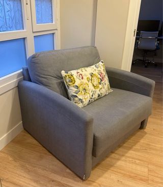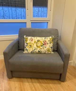Sofá cama de la marca Biandbo, ideal para espacios reducidos. Incluye un cómodo colchón viscoelástico. - Tapicería de tela en tono gris. - Cojín decorativo con estampado floral multicolor. Las medidas han sido tomadas con el sofá cerrado y el cojín central puesto. Se vende por cambio de vivienda e imposibilidad de quedárnoslo. Se compró por 800 euros y su uso ha sido escaso. Precio negociable.