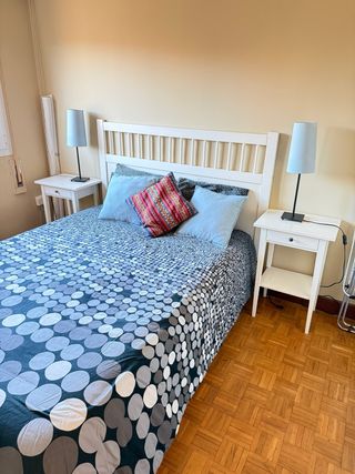 Se vende conjunto de colchón de 135cm, somier y dos mesitas de noche a juego. - Colchón de 135x190cm - Somier metálico de laminas. Medidas 135x190cm - Dos mesitas de noche de madera - Cabecero de madera - Lamparas de mesa