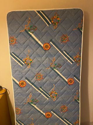 Colchón juvenil de tela con un diseño estampado en tonos azules y amarillos. - Medidas: 90 cm de ancho x 1.90 m de largo. 30 cm de fondo. - Tejido resistente y duradero. Estaba en la parte inferior de una cama nido sin usar, así que está prácticamente a estrenar.