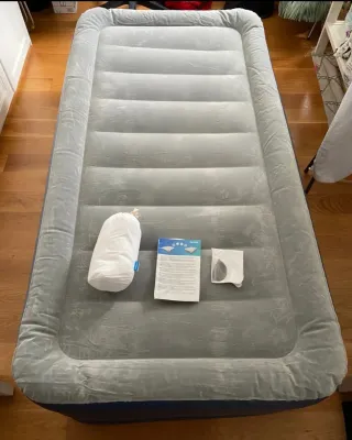 Colchón individual hinchable, ideal para invitados o viajes. - Color azul y gris. - Bomba integrada para inflar y desinflar. Se compró para un invitado y solo se ha usado un día. Se regala sábana bajera