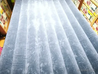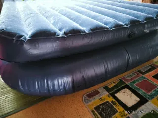 Cama hinchable de plástico y terciopelo con unas medidas de 190x130 cm. Se infla y desinfla en minutos. Comprada en El Corte Inglés. - Color azul. - Diseño con cámaras de aire para mayor comodidad.
