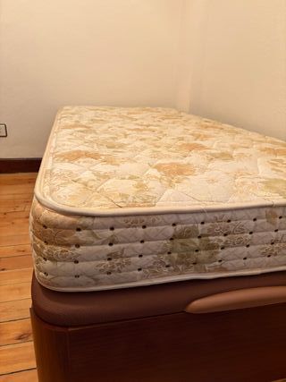 Canapé para cama de 90cm casi sin usar. - Base de madera con tapa tapizada en tela. - Color marrón. - Apertura suave con pistones hidráulicos en perfecto funcionamiento. - Óptima capacidad de almacenamiento. - Estado impecable, sin marcas. +++ Nota: si se quiere comprar con el colchon (que aparece en las fotos) de muelles ensacados, tambien en muy buen estado sin manchas, serían 50 euros más del precio señalado.