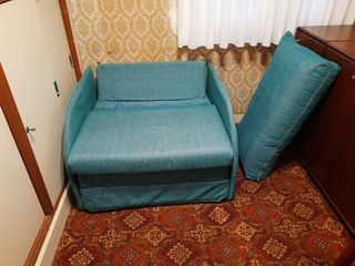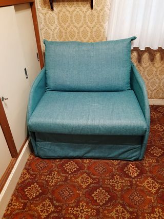 Sofá-cama individual en color turquesa, con unas medidas de colchón 80x180 cm. - Tapicería de tela. - Diseño moderno y funcional - El respaldo se quita para abrir el sofá-cama. Se puede utilizar de cabecero. - Estructura somier metálica y con cinchas elásticas - Las medidas indicadas en el Producto son del Sofá-cama cerrado. - Medida con la cama abierta 192 cm de largo. - Colchón incluido 80 x 180 cm con 12 cm de grosor