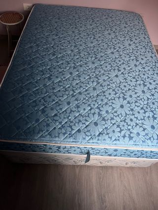 Colchón de 135x190 cm con somier. - Colchón con 750 muelles. - Diseño geométrico en tonos azules y blancos. El colchon lo vendo porque esta un poco blando el centro tengo mal la espalda y se siente un poco blando para mi gusto me costo unos 900 euros y el somier 120 el somier esta perfecto es negro y patas blancas , y lo quito por que tengo canapé y colchon nuevo , colchon esta diseñado para deportistas y mejorar el descanso...en la etiqueta aparece el dia que me lo entregaron en 2023. Quien lo quiera que venga a por el pesa un monton y tiene 32 cm de ancho